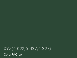 XYZ 4.022,5.437,4.327 Color is a dark green color and the nearest color is Kombu Green #354230. Hex code #2c4836 and RGB value is rgb(44,72,54). In RGB color space, this color is composed of 17% red, 28% green, 21% blue, In CMYK color space, this color is composed of 39% cyan, 0% magenta, 25% yellow , 72% black , In HSL color space, this color has a hue angle of 141° , 24% saturation and 23% lightness.