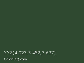 XYZ 4.023,5.452,3.637 Color is a dark green color and the nearest color is Kombu Green #354230. Hex code #2f4830 and RGB value is rgb(47,72,48). In RGB color space, this color is composed of 18% red, 28% green, 19% blue, In CMYK color space, this color is composed of 35% cyan, 0% magenta, 33% yellow , 72% black , In HSL color space, this color has a hue angle of 122° , 21% saturation and 23% lightness.
