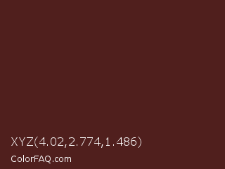 XYZ 4.02,2.774,1.486 Color is a very dark red color and the nearest color is Cocoa Bean #481c1c. Hex code #501f1d and RGB value is rgb(80,31,29). In RGB color space, this color is composed of 31% red, 12% green, 11% blue, In CMYK color space, this color is composed of 0% cyan, 61% magenta, 64% yellow , 69% black , In HSL color space, this color has a hue angle of 2° , 47% saturation and 21% lightness.