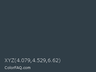 XYZ 4.079,4.529,6.62 Color is a dark blue color and the nearest color is Japanese Indigo #264348. Hex code #303e47 and RGB value is rgb(48,62,71). In RGB color space, this color is composed of 19% red, 24% green, 28% blue, In CMYK color space, this color is composed of 32% cyan, 13% magenta, 0% yellow , 72% black , In HSL color space, this color has a hue angle of 203° , 19% saturation and 23% lightness.