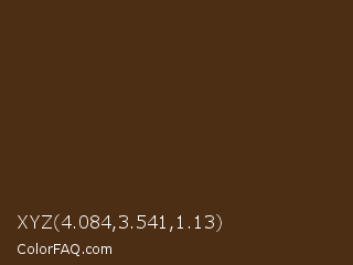 XYZ 4.084,3.541,1.13 Color is a very dark orange color and the nearest color is Brown Derby #492615. Hex code #4c2e14 and RGB value is rgb(76,46,20). In RGB color space, this color is composed of 30% red, 18% green, 8% blue, In CMYK color space, this color is composed of 0% cyan, 39% magenta, 74% yellow , 70% black , In HSL color space, this color has a hue angle of 28° , 58% saturation and 19% lightness.