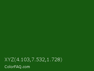 XYZ 4.103,7.532,1.728 Color is a very dark green color and the nearest color is Lincoln Green #195905. Hex code #175a10 and RGB value is rgb(23,90,16). In RGB color space, this color is composed of 9% red, 35% green, 6% blue, In CMYK color space, this color is composed of 74% cyan, 0% magenta, 82% yellow , 65% black , In HSL color space, this color has a hue angle of 114° , 70% saturation and 21% lightness.