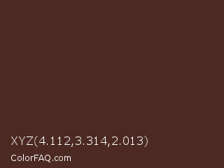 XYZ 4.112,3.314,2.013 Color is a very dark red color and the nearest color is Saddle #4c3024. Hex code #4c2a23 and RGB value is rgb(76,42,35). In RGB color space, this color is composed of 30% red, 16% green, 14% blue, In CMYK color space, this color is composed of 0% cyan, 45% magenta, 54% yellow , 70% black , In HSL color space, this color has a hue angle of 10° , 37% saturation and 22% lightness.
