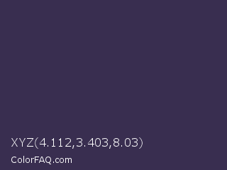 XYZ 4.112,3.403,8.03 Color is a dark indigo color and the nearest color is Martinique #363050. Hex code #392e50 and RGB value is rgb(57,46,80). In RGB color space, this color is composed of 22% red, 18% green, 31% blue, In CMYK color space, this color is composed of 29% cyan, 43% magenta, 0% yellow , 69% black , In HSL color space, this color has a hue angle of 259° , 27% saturation and 25% lightness.