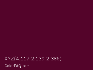 XYZ 4.117,2.139,2.386 Color is a very dark rose color and the nearest color is Castro #52001f. Hex code #54042a and RGB value is rgb(84,4,42). In RGB color space, this color is composed of 33% red, 2% green, 16% blue, In CMYK color space, this color is composed of 0% cyan, 95% magenta, 50% yellow , 67% black , In HSL color space, this color has a hue angle of 332° , 91% saturation and 17% lightness.