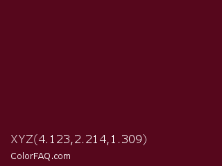 XYZ 4.123,2.214,1.309 Color is a very dark rose color and the nearest color is Dark Scarlet #560319. Hex code #56071c and RGB value is rgb(86,7,28). In RGB color space, this color is composed of 34% red, 3% green, 11% blue, In CMYK color space, this color is composed of 0% cyan, 92% magenta, 67% yellow , 66% black , In HSL color space, this color has a hue angle of 344° , 85% saturation and 18% lightness.