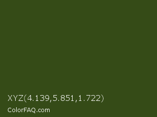 XYZ 4.139,5.851,1.722 Color is a very dark green color and the nearest color is Clover #384910. Hex code #354b17 and RGB value is rgb(53,75,23). In RGB color space, this color is composed of 21% red, 29% green, 9% blue, In CMYK color space, this color is composed of 29% cyan, 0% magenta, 69% yellow , 71% black , In HSL color space, this color has a hue angle of 85° , 53% saturation and 19% lightness.