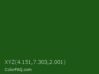 XYZ 4.151,7.303,2.001 Color is a very dark green color and the nearest color is Green House #24500f. Hex code #1d5817 and RGB value is rgb(29,88,23). In RGB color space, this color is composed of 11% red, 35% green, 9% blue, In CMYK color space, this color is composed of 67% cyan, 0% magenta, 74% yellow , 65% black , In HSL color space, this color has a hue angle of 114° , 59% saturation and 22% lightness.