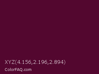 XYZ 4.156,2.196,2.894 Color is a very dark rose color and the nearest color is Blackberry #4d0135. Hex code #53072f and RGB value is rgb(83,7,47). In RGB color space, this color is composed of 33% red, 3% green, 18% blue, In CMYK color space, this color is composed of 0% cyan, 92% magenta, 43% yellow , 67% black , In HSL color space, this color has a hue angle of 328° , 84% saturation and 18% lightness.