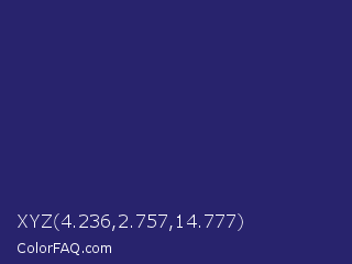 XYZ 4.236,2.757,14.777 Color is a dark indigo color and the nearest color is St Patricks Blue #23297a. Hex code #28236d and RGB value is rgb(40,35,109). In RGB color space, this color is composed of 16% red, 14% green, 43% blue, In CMYK color space, this color is composed of 63% cyan, 68% magenta, 0% yellow , 57% black , In HSL color space, this color has a hue angle of 244° , 51% saturation and 28% lightness.