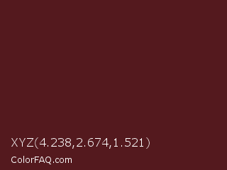 XYZ 4.238,2.674,1.521 Color is a very dark red color and the nearest color is Cocoa Bean #481c1c. Hex code #54191e and RGB value is rgb(84,25,30). In RGB color space, this color is composed of 33% red, 10% green, 12% blue, In CMYK color space, this color is composed of 0% cyan, 70% magenta, 64% yellow , 67% black , In HSL color space, this color has a hue angle of 355° , 54% saturation and 21% lightness.
