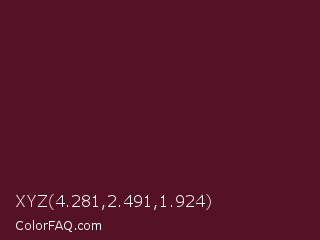 XYZ 4.281,2.491,1.924 Color is a very dark rose color and the nearest color is Maroon Oak #520c17. Hex code #551224 and RGB value is rgb(85,18,36). In RGB color space, this color is composed of 33% red, 7% green, 14% blue, In CMYK color space, this color is composed of 0% cyan, 79% magenta, 58% yellow , 67% black , In HSL color space, this color has a hue angle of 344° , 65% saturation and 20% lightness.