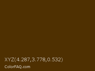 XYZ 4.287,3.778,0.532 Color is a very dark orange color and the nearest color is Deep Bronze #4a3004. Hex code #4f3001 and RGB value is rgb(79,48,1). In RGB color space, this color is composed of 31% red, 19% green, 0% blue, In CMYK color space, this color is composed of 0% cyan, 39% magenta, 99% yellow , 69% black , In HSL color space, this color has a hue angle of 36° , 98% saturation and 16% lightness.