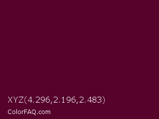 XYZ 4.296,2.196,2.483 Color is a very dark rose color and the nearest color is Bordeaux #5c0120. Hex code #56022b and RGB value is rgb(86,2,43). In RGB color space, this color is composed of 34% red, 1% green, 17% blue, In CMYK color space, this color is composed of 0% cyan, 98% magenta, 50% yellow , 66% black , In HSL color space, this color has a hue angle of 331° , 95% saturation and 17% lightness.