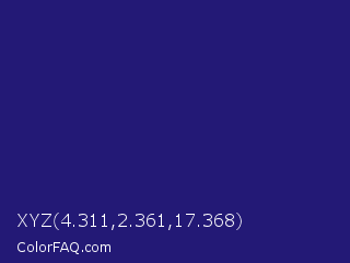 XYZ 4.311,2.361,17.368 Color is a dark indigo color and the nearest color is Midnight Blue #191970. Hex code #231976 and RGB value is rgb(35,25,118). In RGB color space, this color is composed of 14% red, 10% green, 46% blue, In CMYK color space, this color is composed of 70% cyan, 79% magenta, 0% yellow , 54% black , In HSL color space, this color has a hue angle of 246° , 65% saturation and 28% lightness.