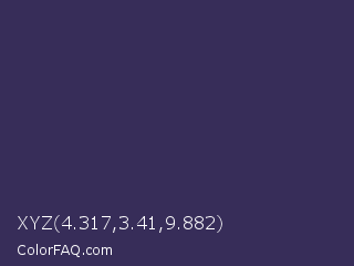 XYZ 4.317,3.41,9.882 Color is a dark indigo color and the nearest color is Martinique #363050. Hex code #372d59 and RGB value is rgb(55,45,89). In RGB color space, this color is composed of 22% red, 18% green, 35% blue, In CMYK color space, this color is composed of 38% cyan, 49% magenta, 0% yellow , 65% black , In HSL color space, this color has a hue angle of 254° , 33% saturation and 26% lightness.