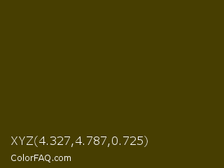 XYZ 4.327,4.787,0.725 Color is a very dark yellow color and the nearest color is Bronze Olive #4e420c. Hex code #473e01 and RGB value is rgb(71,62,1). In RGB color space, this color is composed of 28% red, 24% green, 0% blue, In CMYK color space, this color is composed of 0% cyan, 13% magenta, 99% yellow , 72% black , In HSL color space, this color has a hue angle of 52° , 97% saturation and 14% lightness.