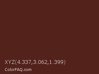 XYZ 4.337,3.062,1.399 Color is a very dark red color and the nearest color is Caput Mortuum #592720. Hex code #53221b and RGB value is rgb(83,34,27). In RGB color space, this color is composed of 33% red, 13% green, 11% blue, In CMYK color space, this color is composed of 0% cyan, 59% magenta, 67% yellow , 67% black , In HSL color space, this color has a hue angle of 8° , 51% saturation and 22% lightness.