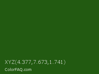 XYZ 4.377,7.673,1.741 Color is a very dark green color and the nearest color is Green House #24500f. Hex code #215a10 and RGB value is rgb(33,90,16). In RGB color space, this color is composed of 13% red, 35% green, 6% blue, In CMYK color space, this color is composed of 63% cyan, 0% magenta, 82% yellow , 65% black , In HSL color space, this color has a hue angle of 106° , 70% saturation and 21% lightness.