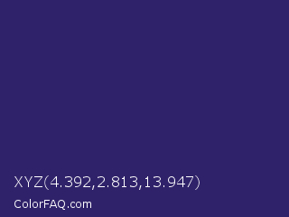 XYZ 4.392,2.813,13.947 Color is a dark indigo color and the nearest color is Jacarta #3a2a6a. Hex code #30226a and RGB value is rgb(48,34,106). In RGB color space, this color is composed of 19% red, 13% green, 42% blue, In CMYK color space, this color is composed of 55% cyan, 68% magenta, 0% yellow , 58% black , In HSL color space, this color has a hue angle of 252° , 51% saturation and 27% lightness.