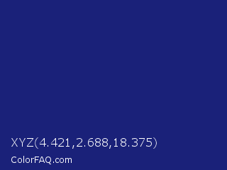 XYZ 4.421,2.688,18.375 Color is a dark blue color and the nearest color is Midnight Blue #191970. Hex code #1a2179 and RGB value is rgb(26,33,121). In RGB color space, this color is composed of 10% red, 13% green, 47% blue, In CMYK color space, this color is composed of 79% cyan, 73% magenta, 0% yellow , 53% black , In HSL color space, this color has a hue angle of 236° , 65% saturation and 29% lightness.