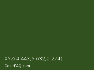 XYZ 4.443,6.632,2.274 Color is a very dark green color and the nearest color is Clover #384910. Hex code #31511e and RGB value is rgb(49,81,30). In RGB color space, this color is composed of 19% red, 32% green, 12% blue, In CMYK color space, this color is composed of 40% cyan, 0% magenta, 63% yellow , 68% black , In HSL color space, this color has a hue angle of 98° , 46% saturation and 22% lightness.
