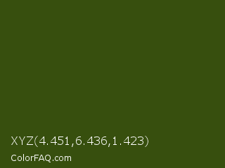 XYZ 4.451,6.436,1.423 Color is a very dark green color and the nearest color is Clover #384910. Hex code #374f0e and RGB value is rgb(55,79,14). In RGB color space, this color is composed of 22% red, 31% green, 5% blue, In CMYK color space, this color is composed of 30% cyan, 0% magenta, 82% yellow , 69% black , In HSL color space, this color has a hue angle of 82° , 70% saturation and 18% lightness.