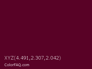 XYZ 4.491,2.307,2.042 Color is a very dark rose color and the nearest color is Bordeaux #5c0120. Hex code #590226 and RGB value is rgb(89,2,38). In RGB color space, this color is composed of 35% red, 1% green, 15% blue, In CMYK color space, this color is composed of 0% cyan, 98% magenta, 57% yellow , 65% black , In HSL color space, this color has a hue angle of 335° , 96% saturation and 18% lightness.