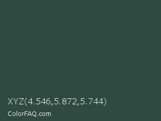 XYZ 4.546,5.872,5.744 Color is a dark green color and the nearest color is Japanese Indigo #264348. Hex code #2f4a40 and RGB value is rgb(47,74,64). In RGB color space, this color is composed of 18% red, 29% green, 25% blue, In CMYK color space, this color is composed of 36% cyan, 0% magenta, 14% yellow , 71% black , In HSL color space, this color has a hue angle of 158° , 22% saturation and 24% lightness.