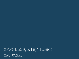 XYZ 4.559,5.18,11.586 Color is a dark blue color and the nearest color is Cello #1e385b. Hex code #1a445f and RGB value is rgb(26,68,95). In RGB color space, this color is composed of 10% red, 27% green, 37% blue, In CMYK color space, this color is composed of 73% cyan, 28% magenta, 0% yellow , 63% black , In HSL color space, this color has a hue angle of 203° , 57% saturation and 24% lightness.