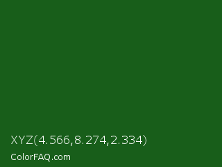 XYZ 4.566,8.274,2.334 Color is a dark green color and the nearest color is Parsley #134f19. Hex code #185e1a and RGB value is rgb(24,94,26). In RGB color space, this color is composed of 9% red, 37% green, 10% blue, In CMYK color space, this color is composed of 74% cyan, 0% magenta, 72% yellow , 63% black , In HSL color space, this color has a hue angle of 122° , 59% saturation and 23% lightness.