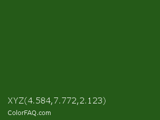 XYZ 4.584,7.772,2.123 Color is a very dark green color and the nearest color is Green House #24500f. Hex code #255a18 and RGB value is rgb(37,90,24). In RGB color space, this color is composed of 15% red, 35% green, 9% blue, In CMYK color space, this color is composed of 59% cyan, 0% magenta, 73% yellow , 65% black , In HSL color space, this color has a hue angle of 108° , 58% saturation and 22% lightness.