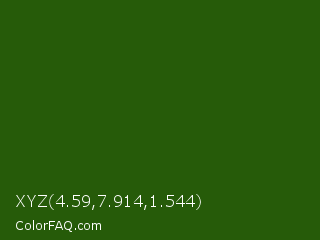 XYZ 4.59,7.914,1.544 Color is a very dark green color and the nearest color is Green House #24500f. Hex code #265b09 and RGB value is rgb(38,91,9). In RGB color space, this color is composed of 15% red, 36% green, 4% blue, In CMYK color space, this color is composed of 58% cyan, 0% magenta, 90% yellow , 64% black , In HSL color space, this color has a hue angle of 99° , 82% saturation and 20% lightness.