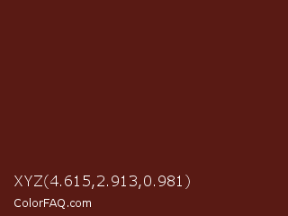 XYZ 4.615,2.913,0.981 Color is a very dark red color and the nearest color is Redwood #5d1e0f. Hex code #591a14 and RGB value is rgb(89,26,20). In RGB color space, this color is composed of 35% red, 10% green, 8% blue, In CMYK color space, this color is composed of 0% cyan, 71% magenta, 78% yellow , 65% black , In HSL color space, this color has a hue angle of 5° , 63% saturation and 21% lightness.