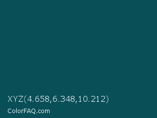 XYZ 4.658,6.348,10.212 Color is a very dark cyan color and the nearest color is Deep Sea Green #095859. Hex code #084f58 and RGB value is rgb(8,79,88). In RGB color space, this color is composed of 3% red, 31% green, 35% blue, In CMYK color space, this color is composed of 91% cyan, 10% magenta, 0% yellow , 65% black , In HSL color space, this color has a hue angle of 187° , 83% saturation and 19% lightness.