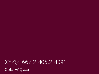 XYZ 4.667,2.406,2.409 Color is a very dark rose color and the nearest color is Bordeaux #5c0120. Hex code #5a032a and RGB value is rgb(90,3,42). In RGB color space, this color is composed of 35% red, 1% green, 16% blue, In CMYK color space, this color is composed of 0% cyan, 97% magenta, 53% yellow , 65% black , In HSL color space, this color has a hue angle of 333° , 94% saturation and 18% lightness.