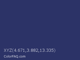 XYZ 4.671,3.882,13.335 Color is a dark blue color and the nearest color is Deep Koamaru #333366. Hex code #2c3367 and RGB value is rgb(44,51,103). In RGB color space, this color is composed of 17% red, 20% green, 40% blue, In CMYK color space, this color is composed of 57% cyan, 50% magenta, 0% yellow , 60% black , In HSL color space, this color has a hue angle of 233° , 40% saturation and 29% lightness.