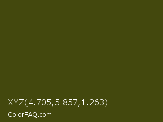 XYZ 4.705,5.857,1.263 Color is a very dark yellow color and the nearest color is Clover #384910. Hex code #43480d and RGB value is rgb(67,72,13). In RGB color space, this color is composed of 26% red, 28% green, 5% blue, In CMYK color space, this color is composed of 7% cyan, 0% magenta, 82% yellow , 72% black , In HSL color space, this color has a hue angle of 65° , 69% saturation and 17% lightness.