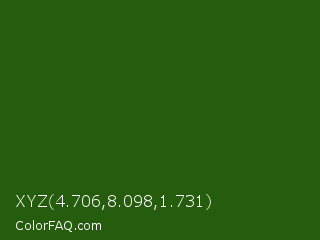 XYZ 4.706,8.098,1.731 Color is a very dark green color and the nearest color is Green House #24500f. Hex code #265c0e and RGB value is rgb(38,92,14). In RGB color space, this color is composed of 15% red, 36% green, 5% blue, In CMYK color space, this color is composed of 59% cyan, 0% magenta, 85% yellow , 64% black , In HSL color space, this color has a hue angle of 102° , 74% saturation and 21% lightness.