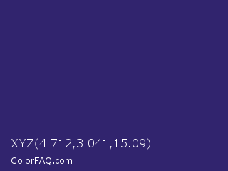 XYZ 4.712,3.041,15.09 Color is a dark indigo color and the nearest color is Jacarta #3a2a6a. Hex code #31246e and RGB value is rgb(49,36,110). In RGB color space, this color is composed of 19% red, 14% green, 43% blue, In CMYK color space, this color is composed of 55% cyan, 67% magenta, 0% yellow , 57% black , In HSL color space, this color has a hue angle of 251° , 51% saturation and 29% lightness.