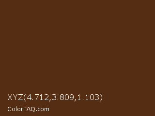 XYZ 4.712,3.809,1.103 Color is a very dark orange color and the nearest color is Jambalaya #5b3013. Hex code #542d13 and RGB value is rgb(84,45,19). In RGB color space, this color is composed of 33% red, 18% green, 7% blue, In CMYK color space, this color is composed of 0% cyan, 46% magenta, 77% yellow , 67% black , In HSL color space, this color has a hue angle of 24° , 63% saturation and 20% lightness.