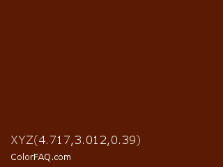 XYZ 4.717,3.012,0.39 Color is a very dark orange color and the nearest color is Brown Bramble #592804. Hex code #5b1b02 and RGB value is rgb(91,27,2). In RGB color space, this color is composed of 36% red, 11% green, 1% blue, In CMYK color space, this color is composed of 0% cyan, 70% magenta, 98% yellow , 64% black , In HSL color space, this color has a hue angle of 17° , 96% saturation and 18% lightness.