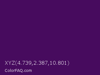 XYZ 4.739,2.387,10.801 Color is a very dark purple color and the nearest color is Clairvoyant #480656. Hex code #470b5e and RGB value is rgb(71,11,94). In RGB color space, this color is composed of 28% red, 4% green, 37% blue, In CMYK color space, this color is composed of 24% cyan, 88% magenta, 0% yellow , 63% black , In HSL color space, this color has a hue angle of 283° , 79% saturation and 21% lightness.