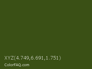 XYZ 4.749,6.691,1.751 Color is a very dark green color and the nearest color is Clover #384910. Hex code #3a5015 and RGB value is rgb(58,80,21). In RGB color space, this color is composed of 23% red, 31% green, 8% blue, In CMYK color space, this color is composed of 28% cyan, 0% magenta, 74% yellow , 69% black , In HSL color space, this color has a hue angle of 82° , 58% saturation and 20% lightness.