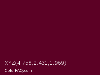 XYZ 4.758,2.431,1.969 Color is a very dark rose color and the nearest color is Bordeaux #5c0120. Hex code #5c0125 and RGB value is rgb(92,1,37). In RGB color space, this color is composed of 36% red, 0% green, 15% blue, In CMYK color space, this color is composed of 0% cyan, 99% magenta, 60% yellow , 64% black , In HSL color space, this color has a hue angle of 336° , 98% saturation and 18% lightness.