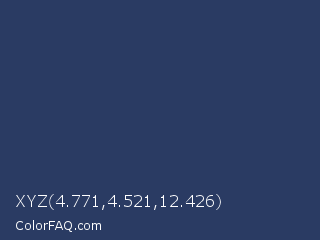 XYZ 4.771,4.521,12.426 Color is a dark blue color and the nearest color is Rhino #2e3f62. Hex code #2a3b63 and RGB value is rgb(42,59,99). In RGB color space, this color is composed of 16% red, 23% green, 39% blue, In CMYK color space, this color is composed of 58% cyan, 40% magenta, 0% yellow , 61% black , In HSL color space, this color has a hue angle of 222° , 40% saturation and 28% lightness.