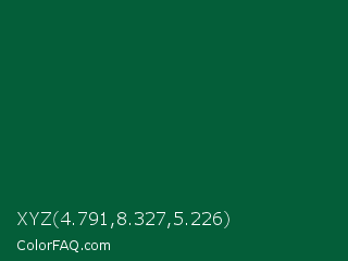 XYZ 4.791,8.327,5.226 Color is a very dark green color and the nearest color is Sacramento State Green #00563f. Hex code #045e39 and RGB value is rgb(4,94,57). In RGB color space, this color is composed of 2% red, 37% green, 22% blue, In CMYK color space, this color is composed of 96% cyan, 0% magenta, 39% yellow , 63% black , In HSL color space, this color has a hue angle of 155° , 92% saturation and 19% lightness.