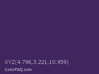 XYZ 4.796,3.221,10.959 Color is a dark violet color and the nearest color is Jacarta #3a2a6a. Hex code #40255e and RGB value is rgb(64,37,94). In RGB color space, this color is composed of 25% red, 15% green, 37% blue, In CMYK color space, this color is composed of 32% cyan, 61% magenta, 0% yellow , 63% black , In HSL color space, this color has a hue angle of 268° , 44% saturation and 26% lightness.