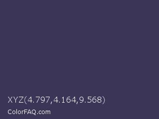 XYZ 4.797,4.164,9.568 Color is a dark indigo color and the nearest color is Martinique #363050. Hex code #3b3557 and RGB value is rgb(59,53,87). In RGB color space, this color is composed of 23% red, 21% green, 34% blue, In CMYK color space, this color is composed of 32% cyan, 39% magenta, 0% yellow , 66% black , In HSL color space, this color has a hue angle of 251° , 24% saturation and 27% lightness.