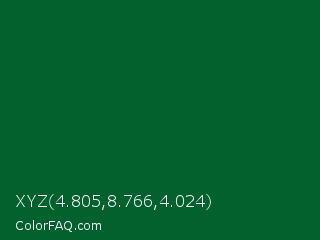 XYZ 4.805,8.766,4.024 Color is a very dark green color and the nearest color is Fun Green #016d39. Hex code #03612e and RGB value is rgb(3,97,46). In RGB color space, this color is composed of 1% red, 38% green, 18% blue, In CMYK color space, this color is composed of 97% cyan, 0% magenta, 53% yellow , 62% black , In HSL color space, this color has a hue angle of 147° , 94% saturation and 20% lightness.